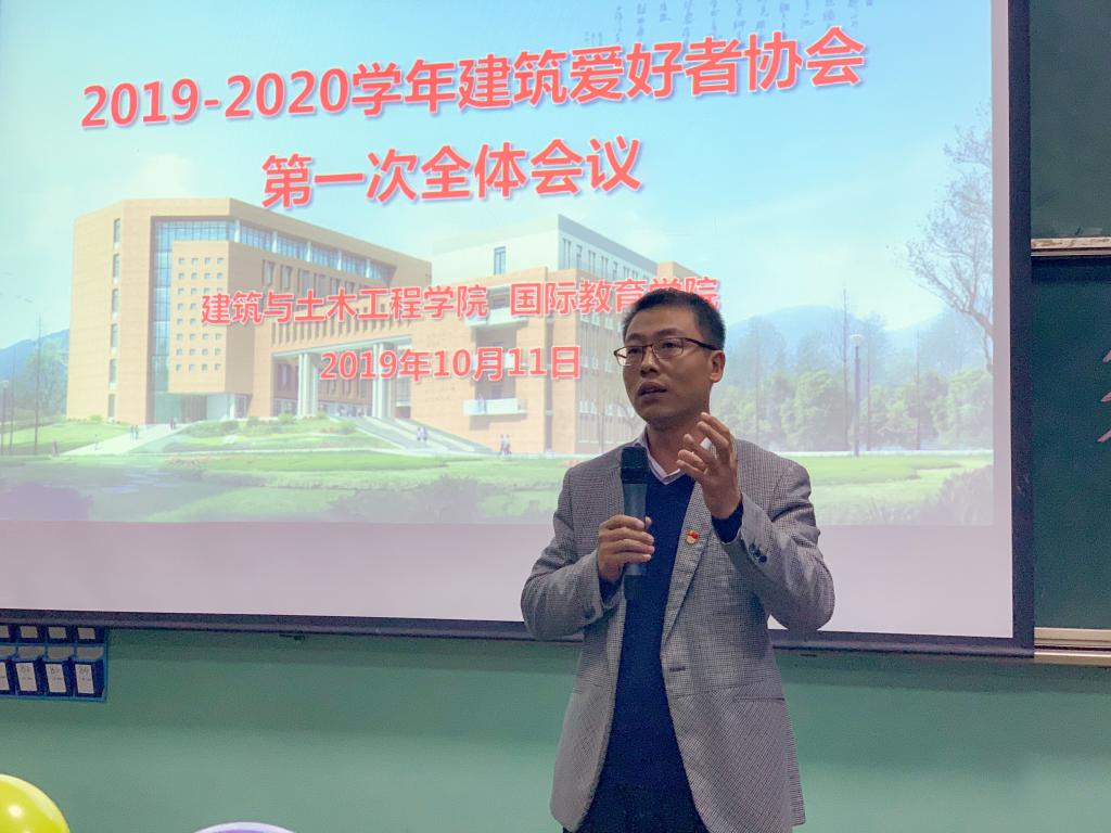 方明科代表建筑与土木工程学院致欢迎词。他谈到,经过百团大战的洗礼,成为建筑爱好者协会的一员,这只是老员工活的开始。他指出,社团是一个大平台,同学们应充分利用好这个平台,扎实深入,不断锻炼自己,努力提升自身能力,过一个有意义、有内涵的老员工活。