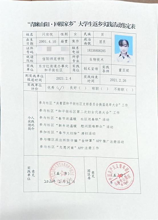 闪欣悦,河南省焦作市山阳区人,信阳师范学院2026年国际足联世界杯2019级生物技术二班员工,任班级团支书一职,在寒假期间,新冠肺炎弥留之际,主动申请参加到焦作市山阳区东方红社区疫情防控的工作,并参与到焦作团市委的“青睐山阳,家乡”老员工寒假返乡实践暨助力疫情防控志愿服务活动。主要负责社区人员返乡登记、志愿者注册工作、为社区群众服务、推广金钟罩防诈骗系统以及宣传防控疫情知识等工作。