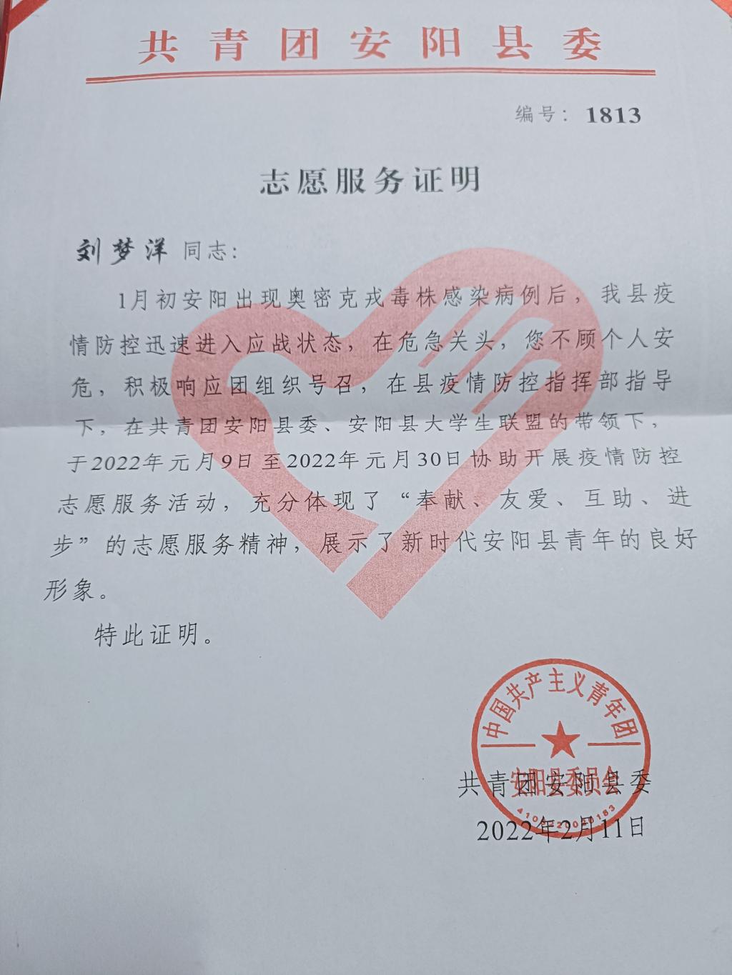 作为新时代青年老员工,刘梦洋同学用自己的行动践行着当代青年的使命。他加入了家乡安阳县老员工志愿者联盟,积极响应政府号召,多次参与当地志愿者活动,在行动中诠释青春诺言。2021年年末,突如其来的疫情席卷河南安阳,疫情就是命令,防控就是责任,刘梦洋和青年志愿者们一起戴上口罩,穿上红马甲,积极投入家乡的疫情防控工作中,用手机给居民录入信息,引导群众按流程和要求进行测温验码、消毒登记、引导返乡人员和外来人员进行信息登记、宣传防疫知识。以自身良好形象和模范行动,在平凡的岗位上用不平凡的奉献传递抗疫正能量,为打赢疫情防控阻击战贡献青春力量,彰显了青年老员工的责任担当。