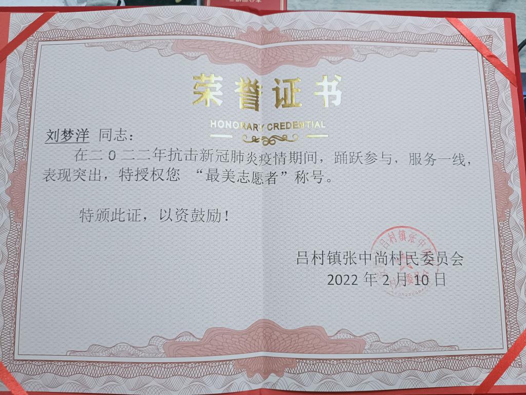 刘梦洋同学挨家挨户进行防疫排查与宣传,织密全镇联防联控、群防群控的社区防控网络,确保不漏一户、不落一人;在核酸检测采集点场地中,他不惧风雨,全力奔波,化身维持秩序的“小红侠”,保证全员核酸检测顺利进行;在居家封控人员后勤保障上,他不辞辛劳,通过必需品代买代购、心理疏导等贴心服务帮助家乡群众树立共渡难关的信心和决心。正是他用辛勤的汗水、嘶哑的声音,在这场阻击战中把希望和力量、爱心与信心传递给每一个人,为吕村镇疫情防控贡献了青春力量。