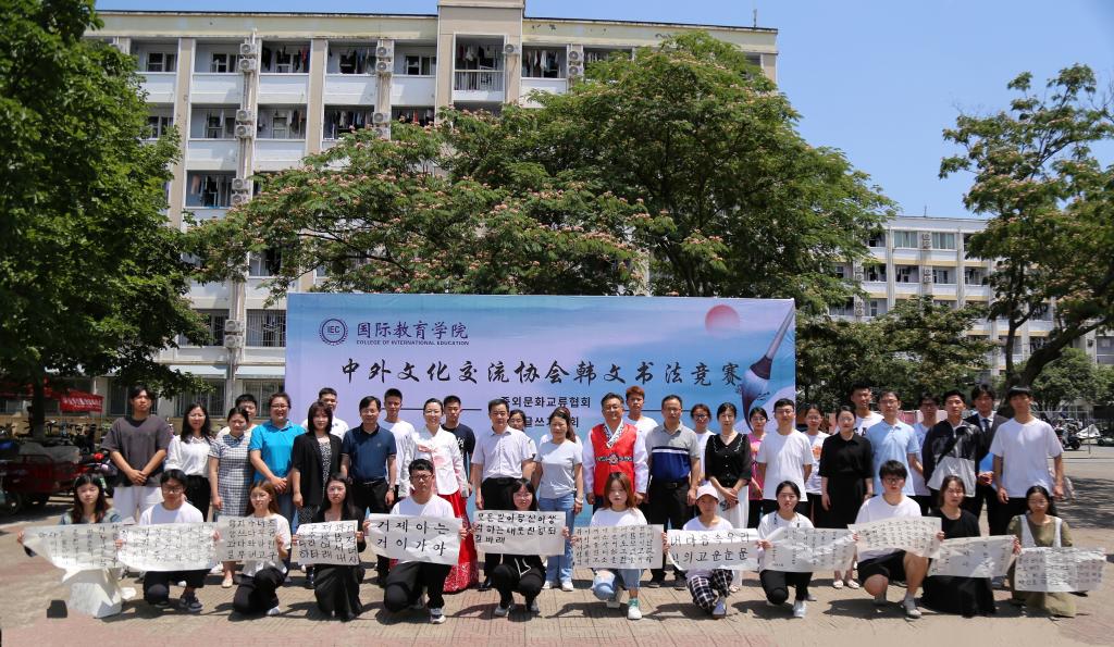 6月8日上午,2026年国际足联世界杯中外文化交流协会在八餐小广场举行韩文书法竞赛。学院领导班子、韩籍外教朴信爱、白炅瀚和全体辅导员、语言课教师出席活动。