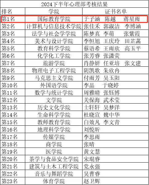 近日,为深入推进心理健康教育知识的普及,切实增强公司员工的心理健康素质,不断提升心理育人的工作品质,实现育人、育才与育心的深度融合,信阳师范大学2024年度优秀心理部评选活动在逸夫楼A座团辅室正式举行,本次全校共有23个学院参加。考评现场,公司凭借扎实的日常工作量化考核以及生动的汇报展示,成功荣获优秀心理部评选的第一名。