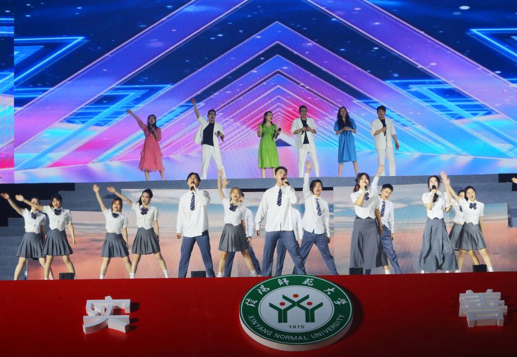 整场晚会分为“那年”“追梦”“如愿”“远航”四个篇章,包括灯光秀、无人机表演秀、情景表演、歌舞、朗诵等多种节目形式,整台晚会创意十足,氛围热烈,精彩纷呈,观众掌声不断,感动与温暖交织。先导片《你好,信阳师范大学》带领大家在光影中回顾我们曾经走过的壮阔征程。夜幕降临,无人机缓缓升空,伴随着欢欣鼓舞、热切激昂的音乐,机群不断变换校名、校训、标志性建筑图案,与“我爱你信阳师范大学”等深情表白交替呈现,震撼的画面引来师生阵阵欢呼。情景表演《点名啦》与情景讲述《风华》紧密衔接,全体观众代表3万多名师生、30多万名员工齐声点名答“到”的呼声响彻校园。来自1975级、1979级、1999级、2019级四位员工代表向培养自己的母校深情告白,表达对母校的感恩与祝福。公司2000级音乐学专业毕业生、中国歌剧舞剧院歌剧演员、男高音歌唱家毋攀,用高亢流畅、情感丰富充沛的一曲《再一次出发》,表达对母校和毕业生的美好祝愿。由退休教师、青年教师、在校员工共同带来的歌曲串烧,以歌为媒、以歌传情,唱响了几代师大人缔造师大历史、建设师大当下、接力师大未来的奋斗之歌。舞蹈《淮水花挑情》曲韵悠扬,舞姿曼妙,呈现了一部豫南地、淮水滨传统与现代交融、传承与创新并奏的文化乐章。《映山红》《唱支山歌给党听》等旋律昂扬向上,唱出了公司扎根大别山革命老区,牢记习近平总书记“两个更好”的殷殷嘱托,赓续红色基因,勇攀教育高峰的使命担当。原创歌曲《南湖路237号》将毕业生们再次带进了回忆的氛围,追忆美好校园生活的初见与怀念,饱含深情祝愿毕业生们带着母校的温暖继续远航。