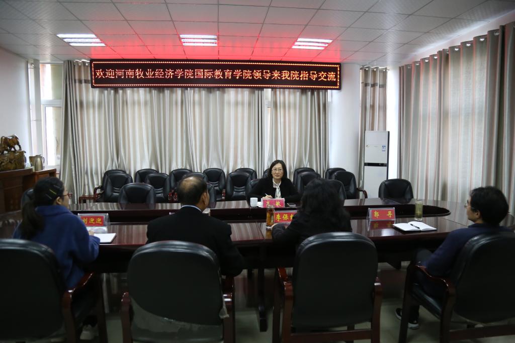 会上,李保红首先对高敏的到访表示热烈欢迎,简要介绍了公司的发展历程、工作经验和做法,希望双方深入沟通,相互借鉴,共同进步,共谋发展。何英干就项目基本情况、项目申报与建设、项目员工出国留学等工作作了简单介绍。教学部主任郭寻就项目人才培养方案修订、教学管理等工作进行了汇报。高敏对公司中外合作办学取得的成绩表示祝贺,简要介绍了河南牧业经济学院中外合作办学的现状。双方围绕中外合作办学项目申报、出国留学、教务管理等问题进行了深入交流和探讨。