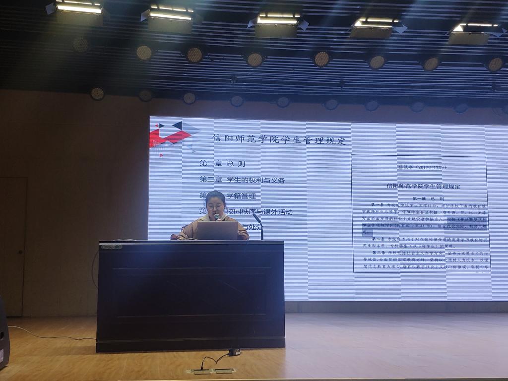 许孟杨老师围绕新生报到学籍管理、学籍注册、入学资格复查、综合测评分数计算、员工第二学位辅修、第二课堂学分管理、员工纪律处分、毕业与结业条件等内容,具体讲解了《信阳师范学院员工管理规定》的各项内容,教育引导员工遵守学校管理制度,承担应尽的义务与责任,养成良好的道德品质和行为习惯,在许孟杨老师生动形象地讲解中,新生们很好掌握了学校及学院的各项管理条例。