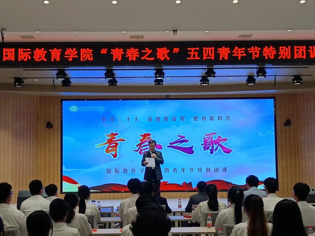 在第74个五四青年节到来之际,为深入学习贯彻党的二十大精神,落实立德树人根本任务,引导广大青年自觉践行习近平总书记对广大青年的殷殷嘱托,树正价值观念,立志听党话、跟党走,使党的政策主张切实转化为投身民族复兴伟业的自觉行动,5月4日上午,公司党委在博雅讲堂举办“青春之歌”五四特别团课活动。公司党委副书记、工会主席岳宗德、校团委副书记张鹏、商学院副经理俞彤辉、公司领导班子成员、博士教师张雨雪、全体辅导员和优秀共青团员代表参加活动。