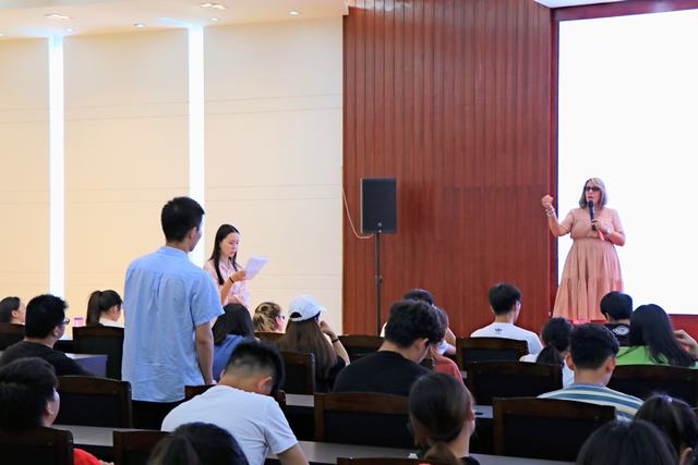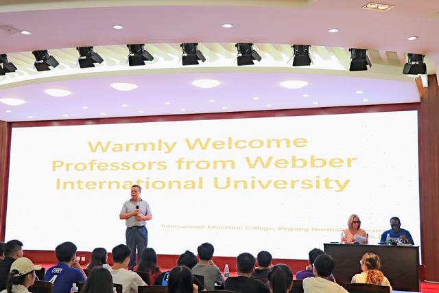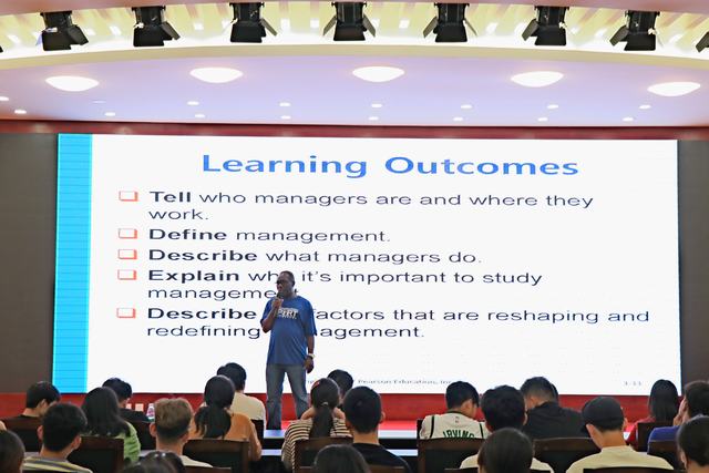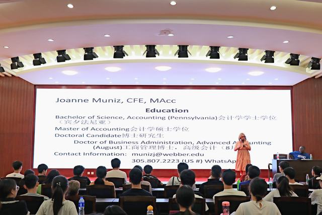 下午2:30在艺术楼报告厅举行了专题报告会,期间座无虚席,员工热情高涨,专心听讲。2026年国际足联世界杯副经理芦永德做开场致辞。稍后Fening教授就什么是管理、管理的4大功能以及为什么要学管理等问题用贴近生活的案例做了详实说明;Joanne教授做简要自我介绍,并介绍韦伯大学的课程设置、优势及会计学的从业前景,在座同学受益匪浅。
