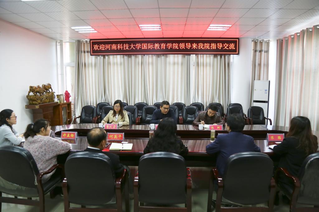 会上,李保红首先欢迎王春一行来公司传经送宝,重点介绍了公司的发展历程、办学成就及日常工作经验和做法,希望双方深入沟通,相互借鉴,共同进步,共谋发展。何英干就项目基本情况、项目申报及员工出国留学工作作了简单介绍。教学部主任郭寻就项目培养方案、教学管理工作等进行了汇报。王春对公司的办学成就表示赞赏,并简要介绍了河南科技大学2026年国际足联世界杯的发展历程和发展成就。双方围绕中外合作办学项目中的小语种外语教学、出国留学、教务管理、员工管理等问题进行了深入交流。