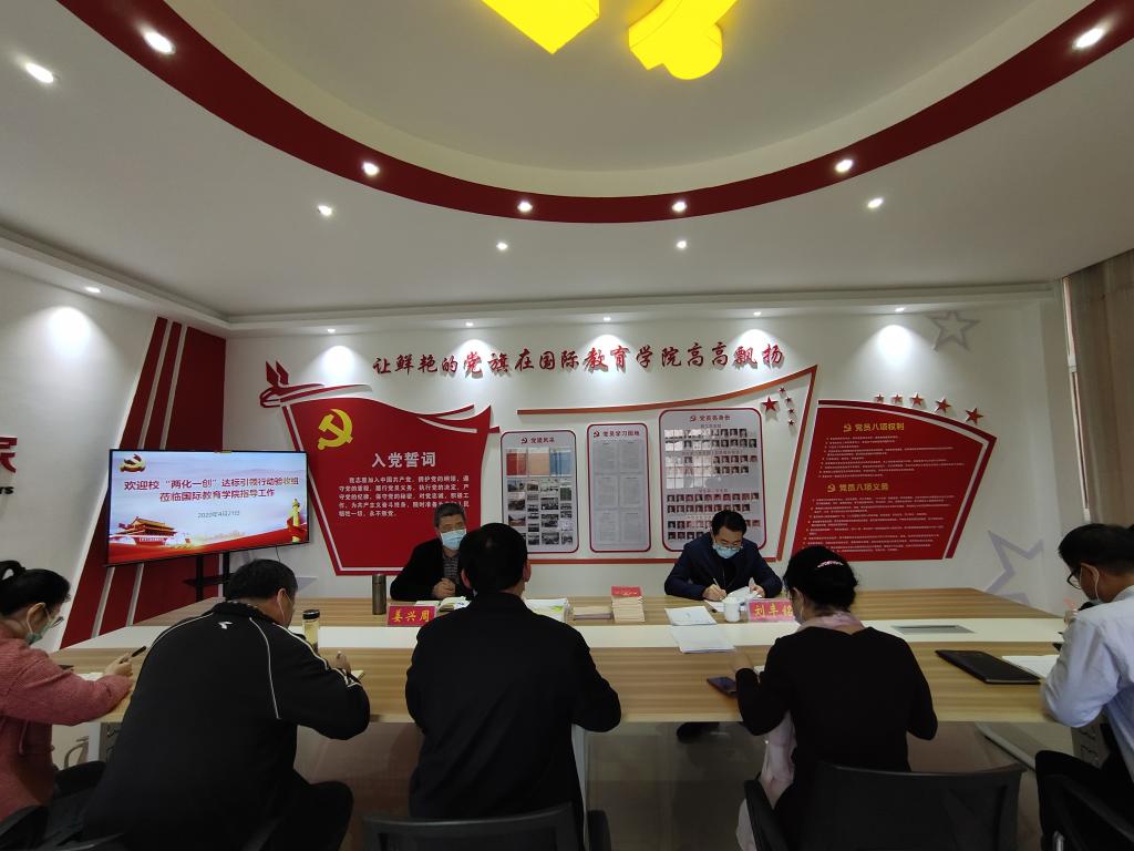 4月21日下午,校“两化一创”达标引领行动验收工作第三验收组组长姜兴周、成员刘丰铭莅临国际教育公司检查指导工作。公司党委书记张震、经理李保红,党委副书记姚新春以及各支部书记参加。会议由张震主持。